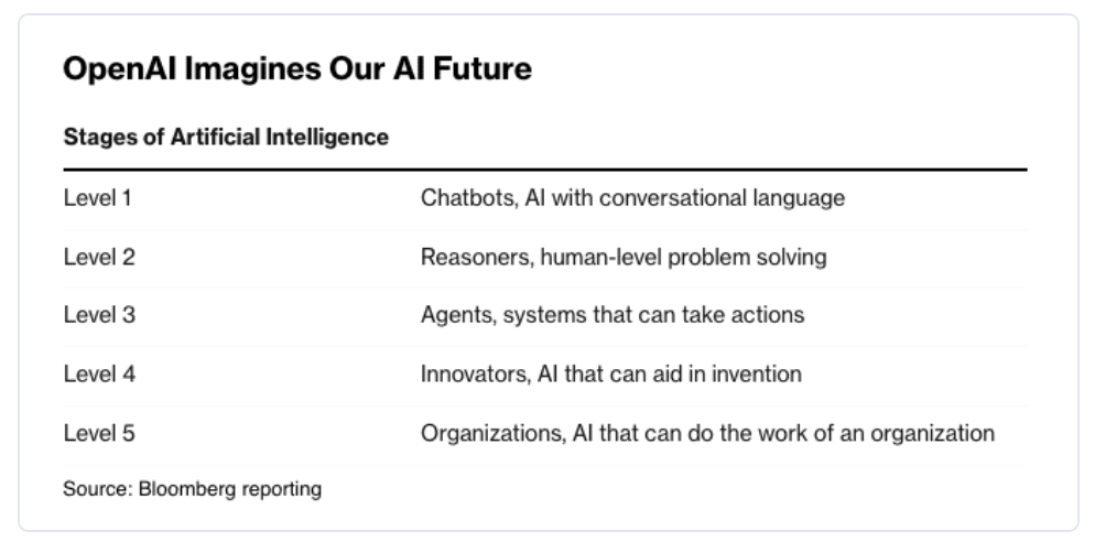 Per Bloomberg reports, there are five levels to AI. By all accounts we are very near Level 2 and our prediction is we will be at Level 3 in 2025. AGI (Artificial General Intelligence) is Level 5. The world is not ready for AGI but the advancements are moving at a speed faster than anyone can comprehend and prepare.